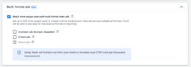 4. Under Multi-format Ads, tick “Reach more unique users with multi-format video ads.” Then deselect In-Stream Ads and In-Feed Ads so only Shorts Ads are allowed.