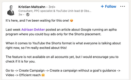 Drawing on information from PPC Specialist Kristian Maltzahn, Senior Paid Search Consultant Yoann Ferrand highlighted the launch of YouTube Shorts Ads in his weekly LinkedIn newsletter, PPC News: