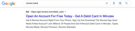 Bidding on competitors’ branded keywords is another common tactic. Here’s an example of other brands’ ads being served on a search for “monzo bank”: