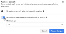 Likewise, if you have an age-restricted ad, select ‘My business advertises age-restricted goods or services’ and set a limit on the age.