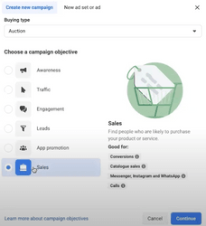 Select your campaign objective – in our case, Sales; and click the ‘Continue’ button you see at the bottom right corner.