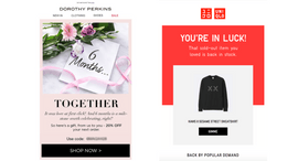These emails from clothing brands Dorothy Perkins and Uniqlo are both designed to solicit another sale from previous buyers: