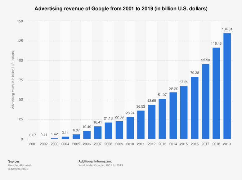 The exponential growth of online advertising can be traced back to the year 2000 when Google launched its AdWords advertising service. Since then, digital marketing has seen and huge increase and Google has managed to grow its advertising revenue every year for the past 19 years and made over $134 billion in 2019 alone, just from advertising.