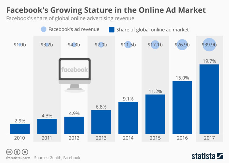 But it’s not just Google who have been cashing in on the growth of digital advertising. In 2007, Facebook launched its own advertising services, which allows advertisers to target users and audiences based on a range of demographics and information. Shortly after launching, Facebook’s ad revenue started to increase exponentially every year and recently hit over $69 billion in advertising revenue in 2019.