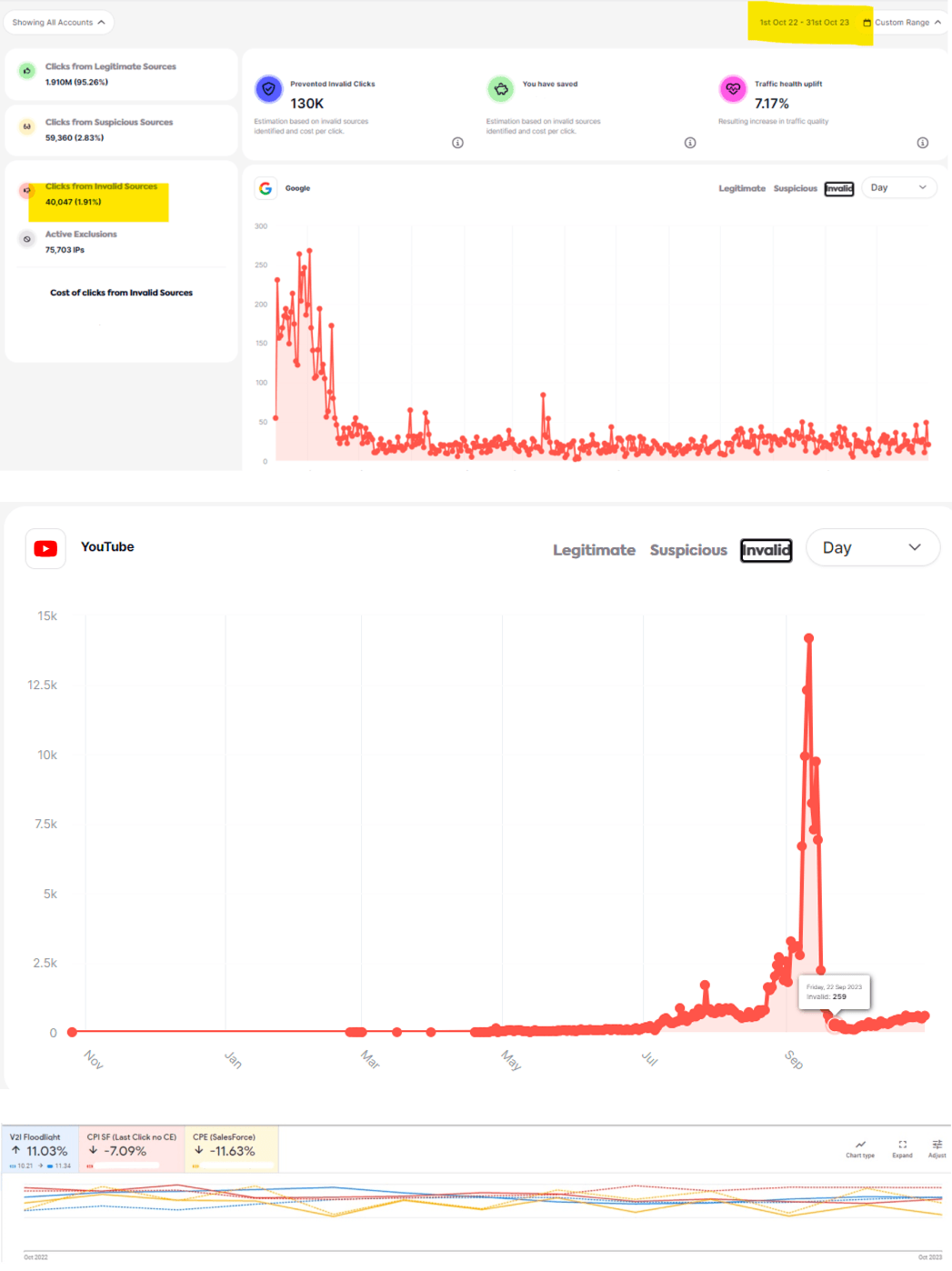 The benefits of multi-channel protection were brought into focus last Sept. when a sudden spike in IVT was visibly noted on YouTube. Between 40% - 50% of traffic was invalid, something that would have been undetectable without Lunio.